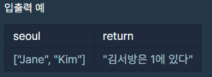 String형 배열 seoul의 element중 "Kim"의 위치 x를 찾아, "김서방은 x에 있다"는 String을 반환하는 함수, solution을 완성하세요. seoul에 "Kim"은 오직 한 번만 나타나며 잘못된 값이 입력되는 경우는 없습니다.