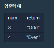 정수 num이 짝수일 경우 "Even"을 반환하고 홀수인 경우 "Odd"를 반환하는 함수, solution을 완성해주세요.