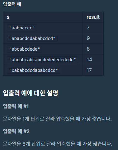 압축할 문자열 s가 매개변수로 주어질 때, 위에 설명한 방법으로 1개 이상 단위로 문자열을 잘라 압축하여 표현한 문자열 중 가장 짧은 것의 길이를 return 하도록 solution 함수를 완성해주세요.