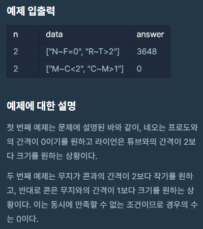 입력은 조건의 개수를 나타내는 정수 n과 n개의 원소로 구성된 문자열 배열 data로 주어진다. data의 원소는 각 프렌즈가 원하는 조건이 N~F=0과 같은 형태의 문자열로 구성되어 있다. 제한조건은 아래와 같다.