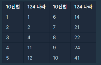 - 124 나라에는 모든 수를 표현할 때 1, 2, 4만 사용합니다.