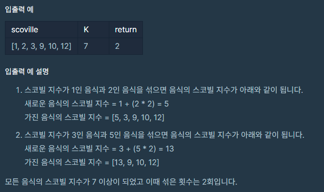 - 모든 음식의 스코빌 지수를 K 이상으로 만들 수 없는 경우에는 -1을 return 합니다.