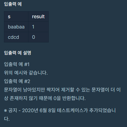 짝지어 제거하기는, 알파벳 소문자로 이루어진 문자열을 가지고 시작합니다. 먼저 문자열에서 같은 알파벳이 2개 붙어 있는 짝을 찾습니다. 그다음, 그 둘을 제거한 뒤, 앞뒤로 문자열을 이어 붙입니다. 이 과정을 반복해서 문자열을 모두 제거한다면 짝지어 제거하기가 종료됩니다. 문자열 S가 주어졌을 때, 짝지어 제거하기를 성공적으로 수행할 수 있는지 반환하는 함수를 완성해 주세요. 성공적으로 수행할 수 있으면 1을, 아닐 경우 0을 리턴해주면 됩니다.