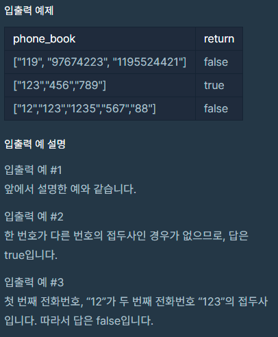 전화번호부에 적힌 전화번호를 담은 배열 phone_book 이 solution 함수의 매개변수로 주어질 때, 어떤 번호가 다른 번호의 접두어인 경우가 있으면 false를 그렇지 않으면 true를 return 하도록 solution 함수를 작성해주세요.