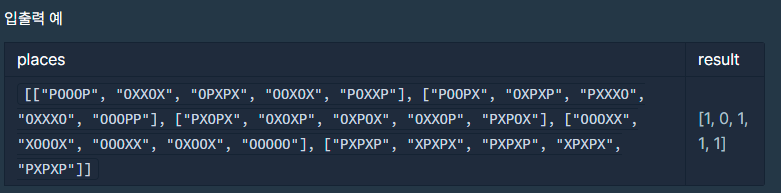 5개의 대기실을 본 죠르디는 각 대기실에서 응시자들이 거리두기를 잘 기키고 있는지 알고 싶어졌습니다. 자리에 앉아있는 응시자들의 정보와 대기실 구조를 대기실별로 담은 2차원 문자열 배열 places가 매개변수로 주어집니다. 각 대기실별로 거리두기를 지키고 있으면 1을, 한 명이라도 지키지 않고 있으면 0을 배열에 담아 return 하도록 solution 함수를 완성해 주세요.