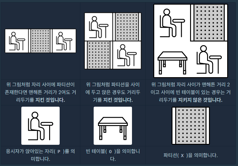 - 거리두기를 위하여 응시자들 끼리는 맨해튼 거리 2 이하로 앉지 말아 주세요.