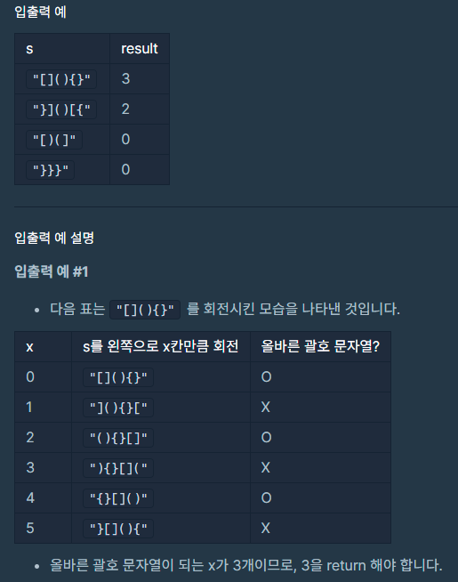 대괄호, 중괄호, 그리고 소괄호로 이루어진 문자열 s가 매개변수로 주어집니다. 이 s를 왼쪽으로 x (0 ≤ x < (s의 길이)) 칸만큼 회전시켰을 때 s가 올바른 괄호 문자열이 되게 하는 x의 개수를 return 하도록 solution 함수를 완성해주세요.