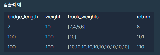 solution 함수의 매개변수로 다리에 올라갈 수 있는 트럭 수 bridge_length, 다리가 견딜 수 있는 무게 weight, 트럭 별 무게 truck_weights가 주어집니다. 이때 모든 트럭이 다리를 건너려면 최소 몇 초가 걸리는지 return 하도록 solution 함수를 완성하세요.