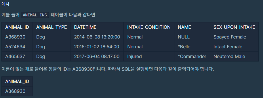 ANIMAL_INS 테이블은 동물 보호소에 들어온 동물의 정보를 담은 테이블입니다. ANIMAL_INS 테이블 구조는 다음과 같으며, ANIMAL_ID, ANIMAL_TYPE, DATETIME, INTAKE_CONDITION, NAME, SEX_UPON_INTAKE는 각각 동물의 아이디, 생물 종, 보호 시작일, 보호 시작 시 상태, 이름, 성별 및 중성화 여부를 나타냅니다.