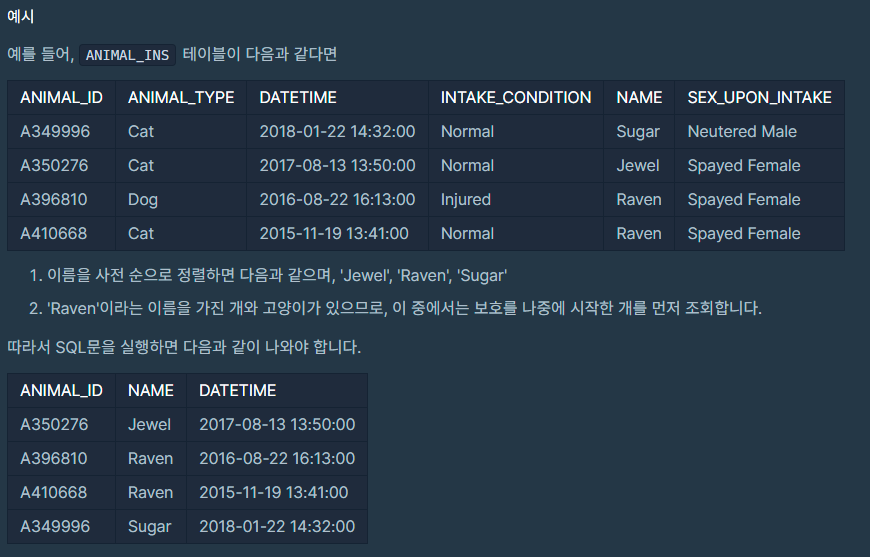 ANIMAL_INS 테이블은 동물 보호소에 들어온 동물의 정보를 담은 테이블입니다. ANIMAL_INS 테이블 구조는 다음과 같으며, ANIMAL_ID, ANIMAL_TYPE, DATETIME, INTAKE_CONDITION, NAME, SEX_UPON_INTAKE는 각각 동물의 아이디, 생물 종, 보호 시작일, 보호 시작 시 상태, 이름, 성별 및 중성화 여부를 나타냅니다.