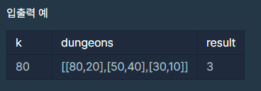이 게임에는 하루에 한 번씩 탐험할 수 있는 던전이 여러개 있는데, 한 유저가 오늘 이 던전들을 최대한 많이 탐험하려 합니다. 유저의 현재 피로도 k와 각 던전별 "최소 필요 피로도", "소모 피로도"가 담긴 2차원 배열 dungeons 가 매개변수로 주어질 때, 유저가 탐험할수 있는 최대 던전 수를 return 하도록 solution 함수를 완성해주세요.