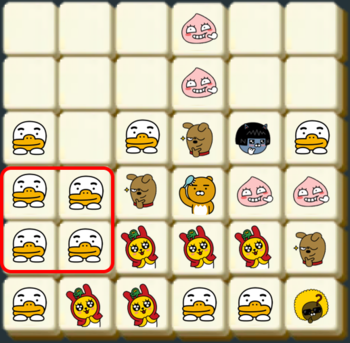 만약 판이 위와 같이 주어질 경우, 라이언이 2×2로 배치된 7개 블록과 콘이 2×2로 배치된 4개 블록이 지워진다. 같은 블록은 여러 2×2에 포함될 수 있으며, 지워지는 조건에 만족하는 2×2 모양이 여러 개 있다면 한꺼번에 지워진다.