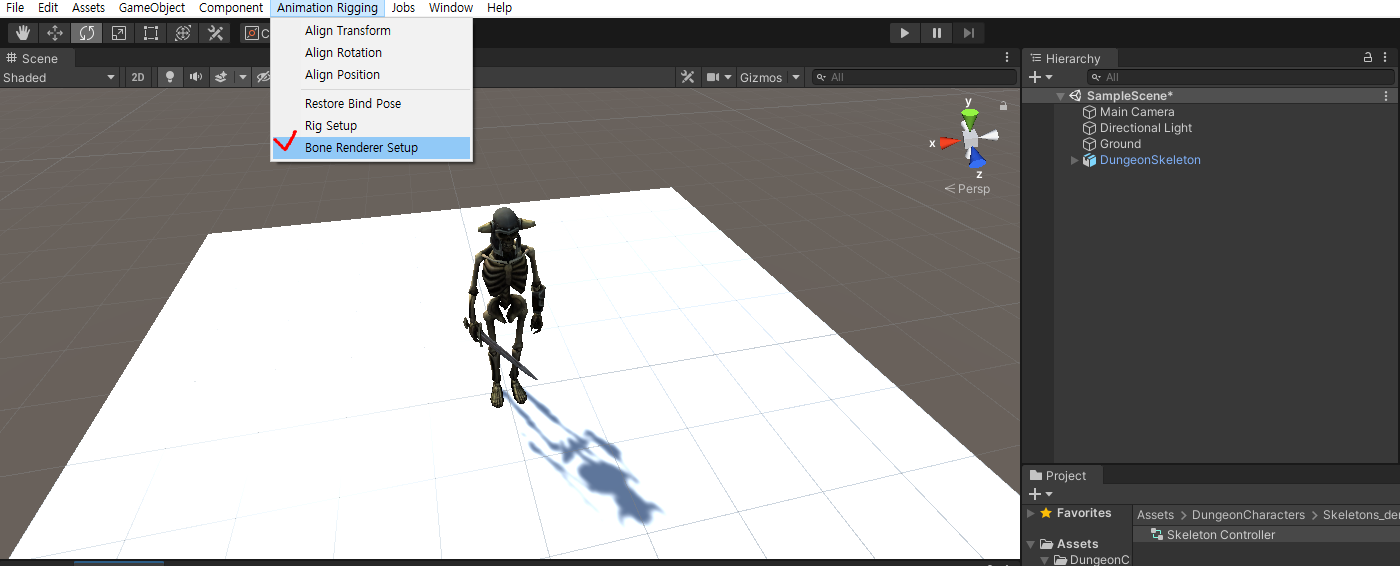 던전 스켈레톤을 누르고 상단에 Animation Rigging - Bone Renderer Setup을 클릭하면 된다.