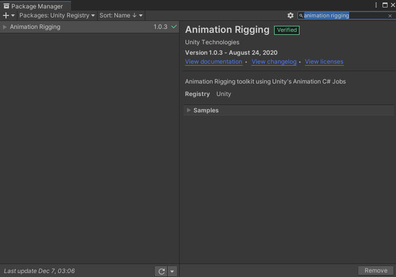 Windows - Package Manager에서 Animation Rigging 패키지를 검색하고 Install 한다.
