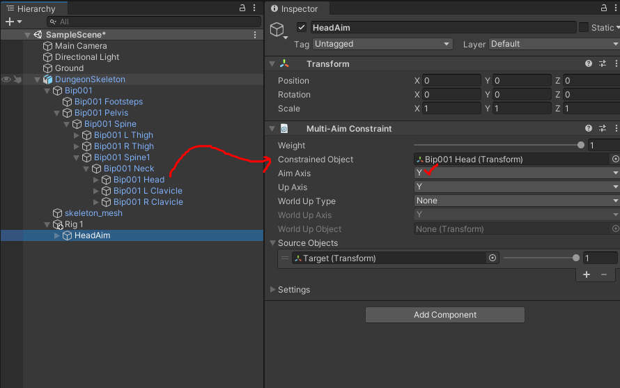 - Constrained Object에 제약조건이 걸릴 뼈대를 넘겨주면 되는데, 본 실습에선 머리에 애니메이션 리깅을 적용하고 싶으니 Constrained Object에 던전 스켈레톤의 Head 뼈대를 넘겨주고 Aim Axis를 Y로 변경해 주자.