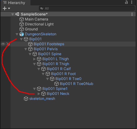 Hierarchy 창에서 던전 스켈레톤의 자식 오브젝트 중 Bip001은 캐릭터의 뼈대로 릭(Rig)이라고 불리며 릭은 캐릭터의 개별 뼈를 구성하는 오브젝트의 계층구조를 가진다.