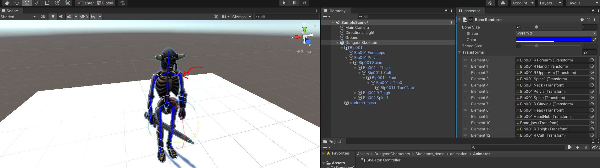 Bone Renderer Setup를 클릭하면 던전 스켈레톤에 Bone Renderer라는 컴포넌트가 추가되며 동시에 Scene 뷰에 던전 스켈레톤의 뼈대가 표시되고 마우스로 쉽게 클릭도 가능해진다!
