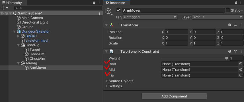 Two Bone IK Constraint 컴포넌트에 세 개의 본 Root, Mid, Tip을 넘겨줘야 한다.