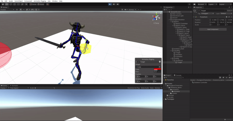 Hierarchy 창에서 던전 스켈레톤을 클릭하고 Animation Rigging - Rig Setup을 클릭하면 Rig 2 오브젝트가 생성된다.