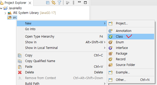 10. src 오른쪽 클릭 -> New -> Class 클릭