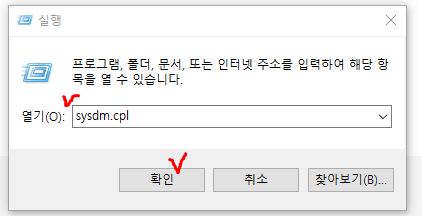 2. Windows + r 키를 눌러 실행창을 열어주고 sysdm.cpl을 입력