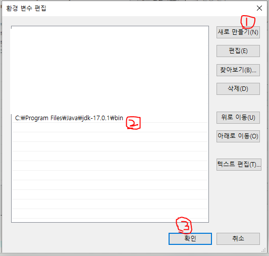 5. C:\Program Files\Java\jdk-17.0.1\bin를 환경 변수에 추가하기.