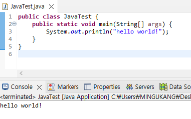 12. main 메서드 내에 System.out.println("hello world!");를 입력하고 실행하면 콘솔 창에 hello world!가 출력된다.