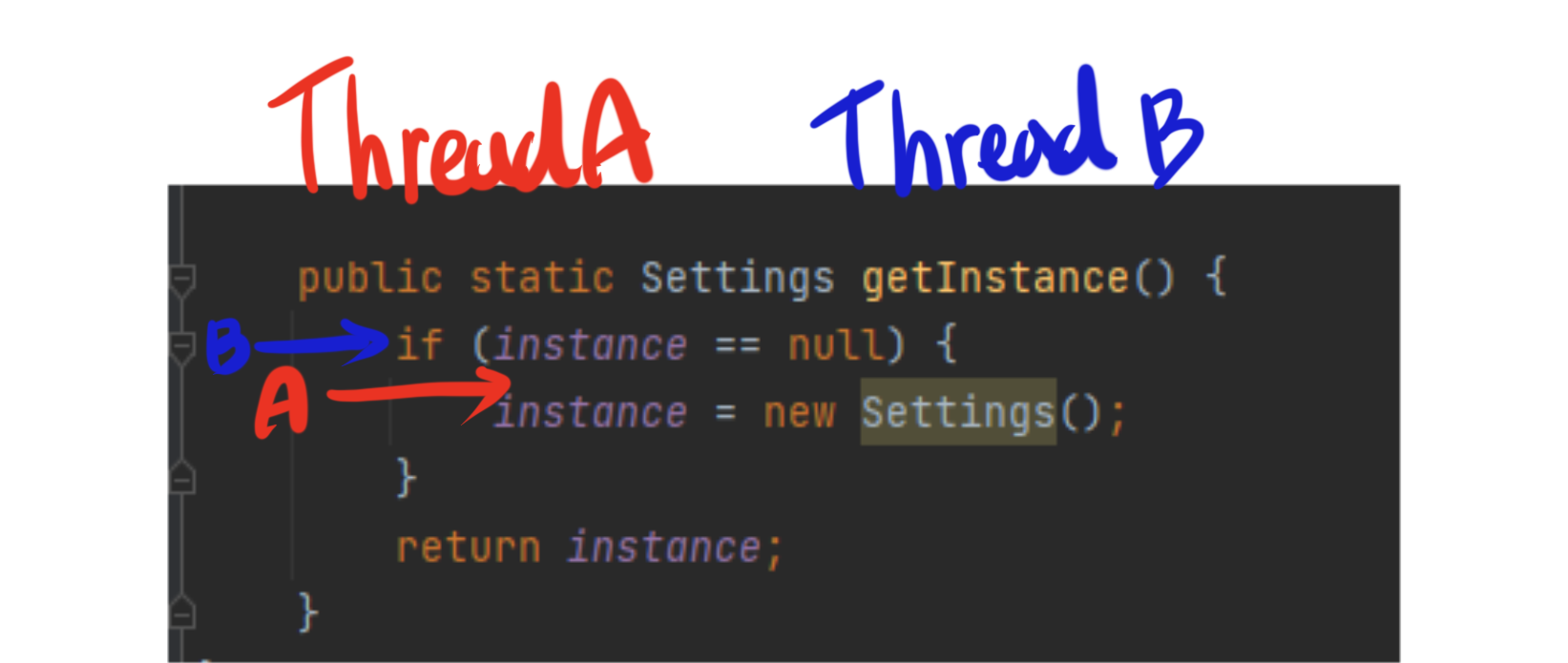 Thread A가 if의 조건을 통과하고 new를 하기 전에 Thread B가 if문을 검사한다면 Thread A와 B 모두 인스턴스를 생성하게 된다.
