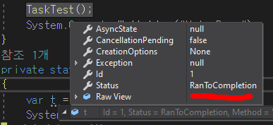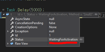 5초를 기다리지 않고 "TaskTest Done"이 바로 출력되는 이유는 Task.Delay(5000);의 반환 값인 5초를 기다리는 작업(Task)을 await 하지 않았기 때문이다. Task를 await 하지 않았기에 프로그램은 5초를 기다리는 작업이 완료되길 기다리지 않고 계속 실행된다. 실제로 await 하지 않은 Task의 Status를 살펴보면 대기(WaitingForActivation)후 완료(RanToCompletion)됨을 볼 수 있다. 마치 혼자 눈 감고 5초를 셌는데 기다리는 친구는 아무도 없는 느낌이다.