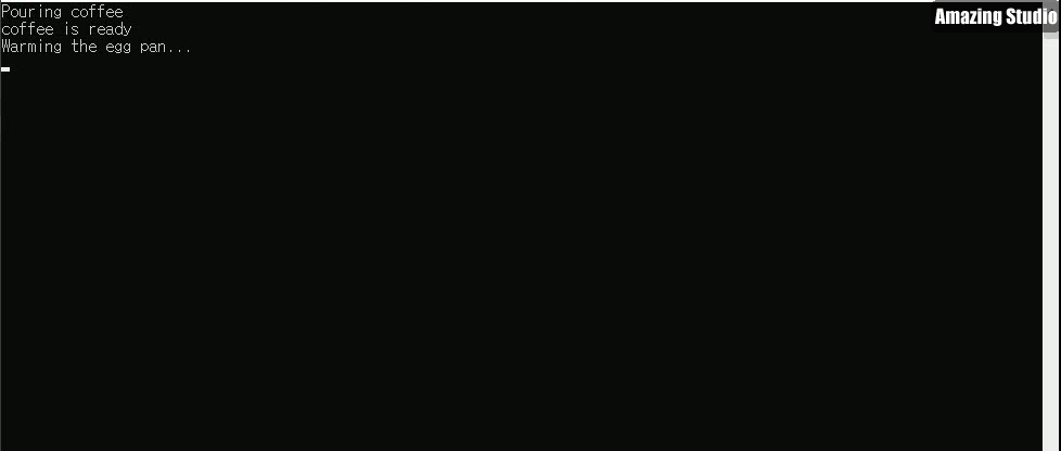 이젠 비동기식 코드로 한 단계 개선했다. 계란, 베이컨, 토스트를 만드는 일을 동시에 시작하게 되었다.