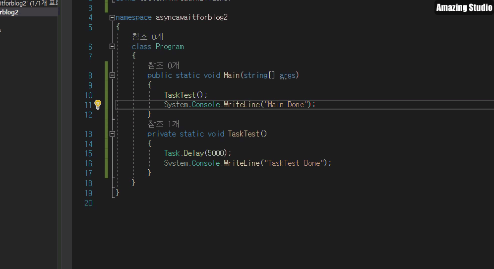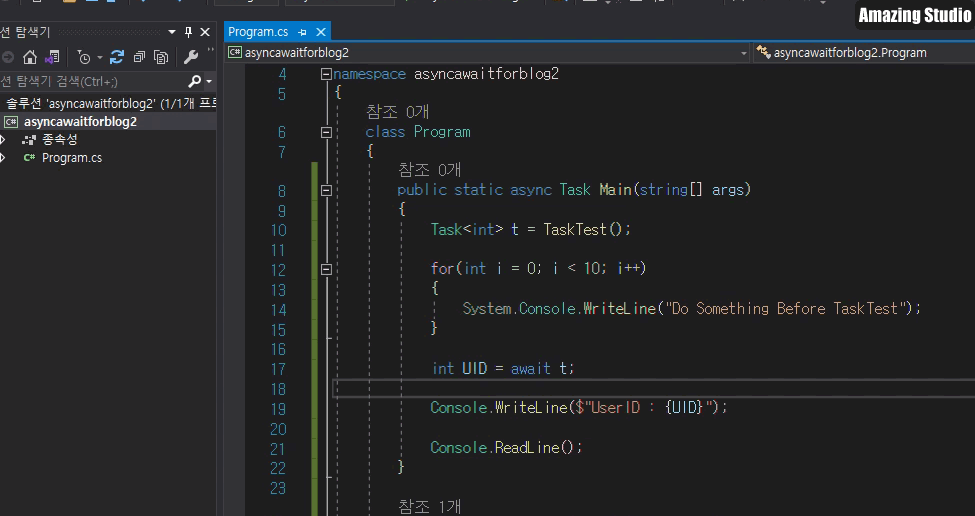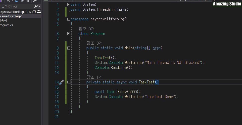 이젠 async와 await 키워드를 사용해서 Task.Delay(5000)를 비동기적으로 수행함과 동시에 흐름을 제어해보자.