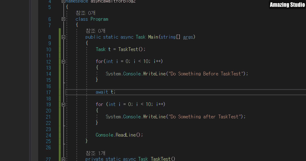 이제 Main 메서드도 async 메서드이다. 즉 Main 내부에서 await 키워드를 사용할 수 있으며 TaskTest 메서드처럼 t(awaitable)이 끝나기 전까지 그다음 코드가 실행되지 않게 된다.