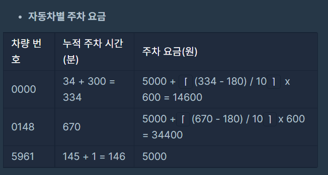 - 어떤 차량이 입차된 후에 출차된 내역이 없다면, 23:59에 출차된 것으로 간주합니다.
