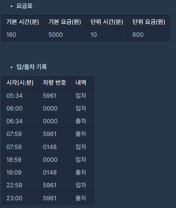 - 00:00부터 23:59까지의 입/출차 내역을 바탕으로 차량별 누적 주차 시간을 계산하여 요금을 일괄로 정산합니다.