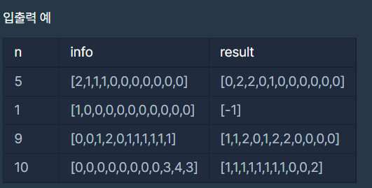 화살의 개수를 담은 자연수 n, 어피치가 맞힌 과녁 점수의 개수를 10점부터 0점까지 순서대로 담은 정수 배열 info가 매개변수로 주어집니다. 이때, 라이언이 가장 큰 점수 차이로 우승하기 위해 n발의 화살을 어떤 과녁 점수에 맞혀야 하는지를 10점부터 0점까지 순서대로 정수 배열에 담아 return 하도록 solution 함수를 완성해 주세요.