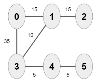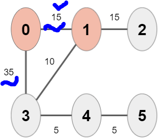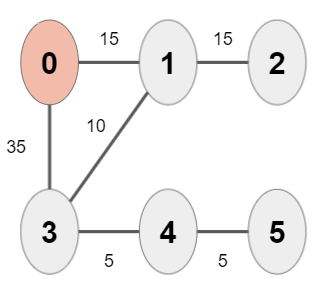 시작 정점인 "0"번 정점은 최단거리가 "0"이므로 DIST[ 0, ∞, ∞, ∞, ∞, ∞ ]를 갱신하고 "0"번 정점과 인접한 정점까지의 최단거리를 계산한다. DIST[0,15, ∞, 35, ∞, ∞ ]