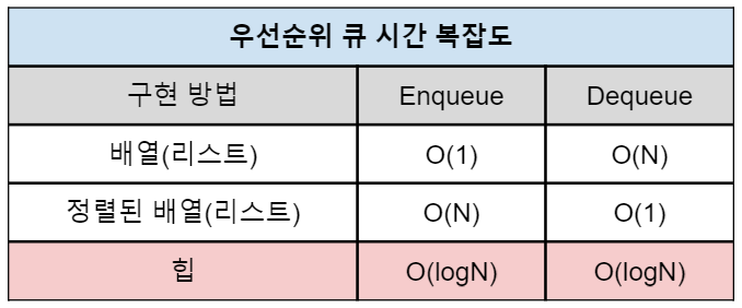 힙으로 구현한 우선순위 큐는 Enqueue와 Dequeue 모두 O(logN)의 시간 복잡도를 가진다.