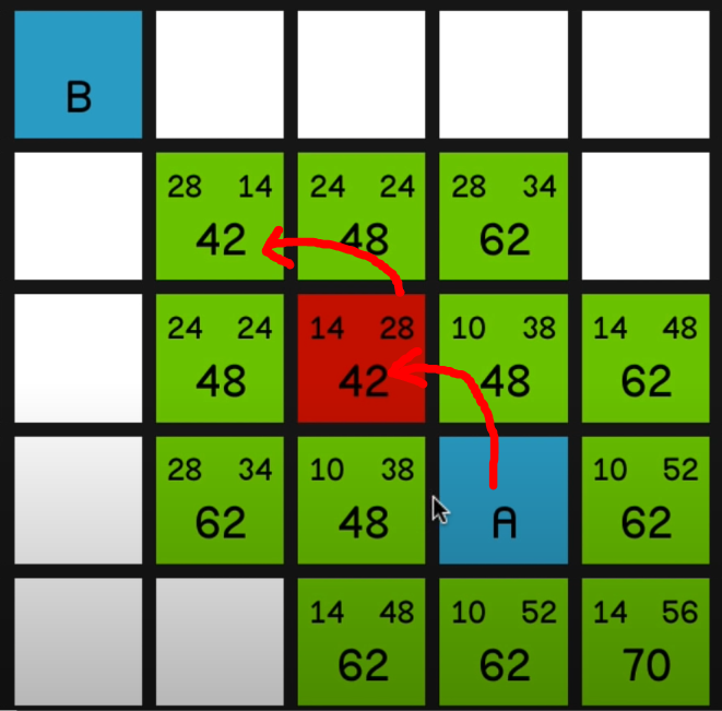 이처럼 가장 작은 f(n)을 가진 노드를 찾아가고 다시 주변 노드의 f(n)을 계산하고 찾아가고 계산하는 과정을 반복하면 목표 노드인 B에 도착할 수 있다.