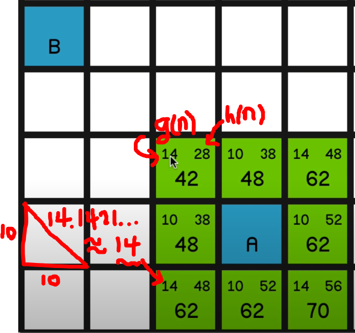 간단하게 예제를 살펴보면 시작 노드(A)와 목표 노드(B)가 있을 때, A 주변 노드의 f(n)을 구하면 다음과 같다.