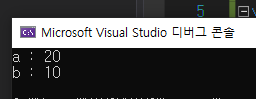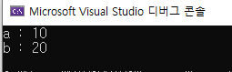 a와 b는 각각 10과 20으로 초기화했고 함수는 인자로 받은 두 값을 바꾸는 작업을 수행한다.