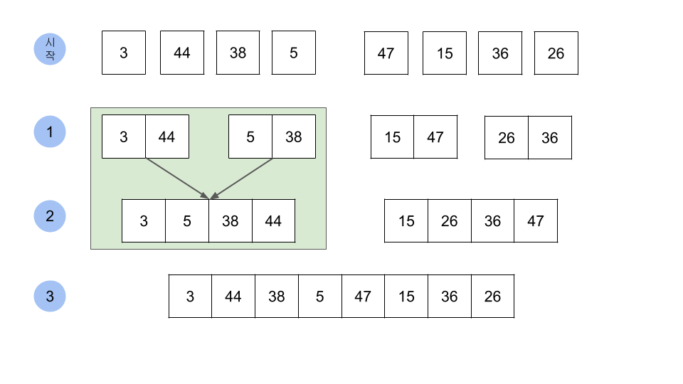 정복 : 두 집합을 하나로 합쳐 정렬을 한다. 즉 [3]과 [44]을 합치고 정렬 [38]과 [5], [47]과 [15], [36]과 [26]을 각각 합치고 정렬하면 다음과 같다. [3, 44] [5, 38] [15, 47], [26, 36]