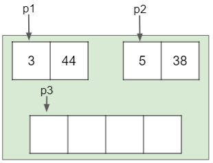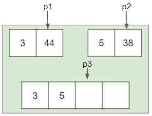 위 그림에서 초록색 부분을 보자. 여기 [3, 44] [5, 38] 두 배열의 시작 위치를 가리키는 변수 p1과 p2가 있으며 임시 공간의 시작 위치를 가리키는 p3도 있다. 이제 두 배열을 합쳐 임시 공간에 정렬된 상태로 저장할 계획이다.