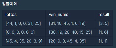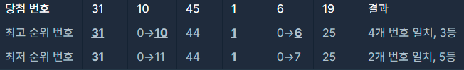 알아볼 수 없는 번호를 0으로 표기하기로 하고, 민우가 구매한 로또 번호 6개가 44, 1, 0, 0, 31 25라고 가정해보겠습니다. 당첨 번호 6개가 31, 10, 45, 1, 6, 19라면, 당첨 가능한 최고 순위와 최저 순위의 한 예는 아래와 같습니다.