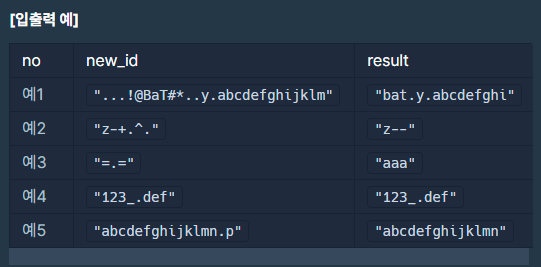 카카오에 입사한 신입 개발자 네오는 "카카오계정개발팀"에 배치되어, 카카오 서비스에 가입하는 유저들의 아이디를 생성하는 업무를 담당하게 되었습니다. "네오"에게 주어진 첫 업무는 새로 가입하는 유저들이 카카오 아이디 규칙에 맞지 않는 아이디를 입력했을 때, 입력된 아이디와 유사하면서 규칙에 맞는 아이디를 추천해주는 프로그램을 개발하는 것입니다.