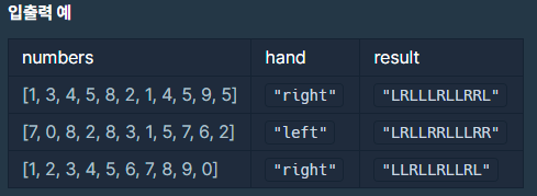 순서대로 누를 번호가 담긴 배열 numbers, 왼손잡이인지 오른손잡이인 지를 나타내는 문자열 hand가 매개변수로 주어질 때, 각 번호를 누른 엄지손가락이 왼손인 지 오른손인 지를 나타내는 연속된 문자열 형태로 return 하도록 solution 함수를 완성해주세요.