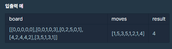 게임 화면의 격자의 상태가 담긴 2차원 배열 board와 인형을 집기 위해 크레인을 작동시킨 위치가 담긴 배열 moves가 매개변수로 주어질 때, 크레인을 모두 작동시킨 후 터트려져 사라진 인형의 개수를 return 하도록 solution 함수를 완성해주세요.
