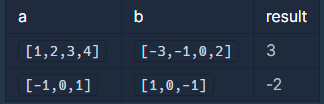 이때, a와 b의 내적은 a[0]*b[0] + a[1]*b[1] + ... + a[n-1]*b[n-1] 입니다. (n은 a, b의 길이)