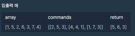 배열 array, [i, j, k]를 원소로 가진 2차원 배열 commands가 매개변수로 주어질 때, commands의 모든 원소에 대해 앞서 설명한 연산을 적용했을 때 나온 결과를 배열에 담아 return 하도록 solution 함수를 작성해주세요.