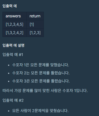 1번 문제부터 마지막 문제까지의 정답이 순서대로 들은 배열 answers가 주어졌을 때, 가장 많은 문제를 맞힌 사람이 누구인지 배열에 담아 return 하도록 solution 함수를 작성해주세요.